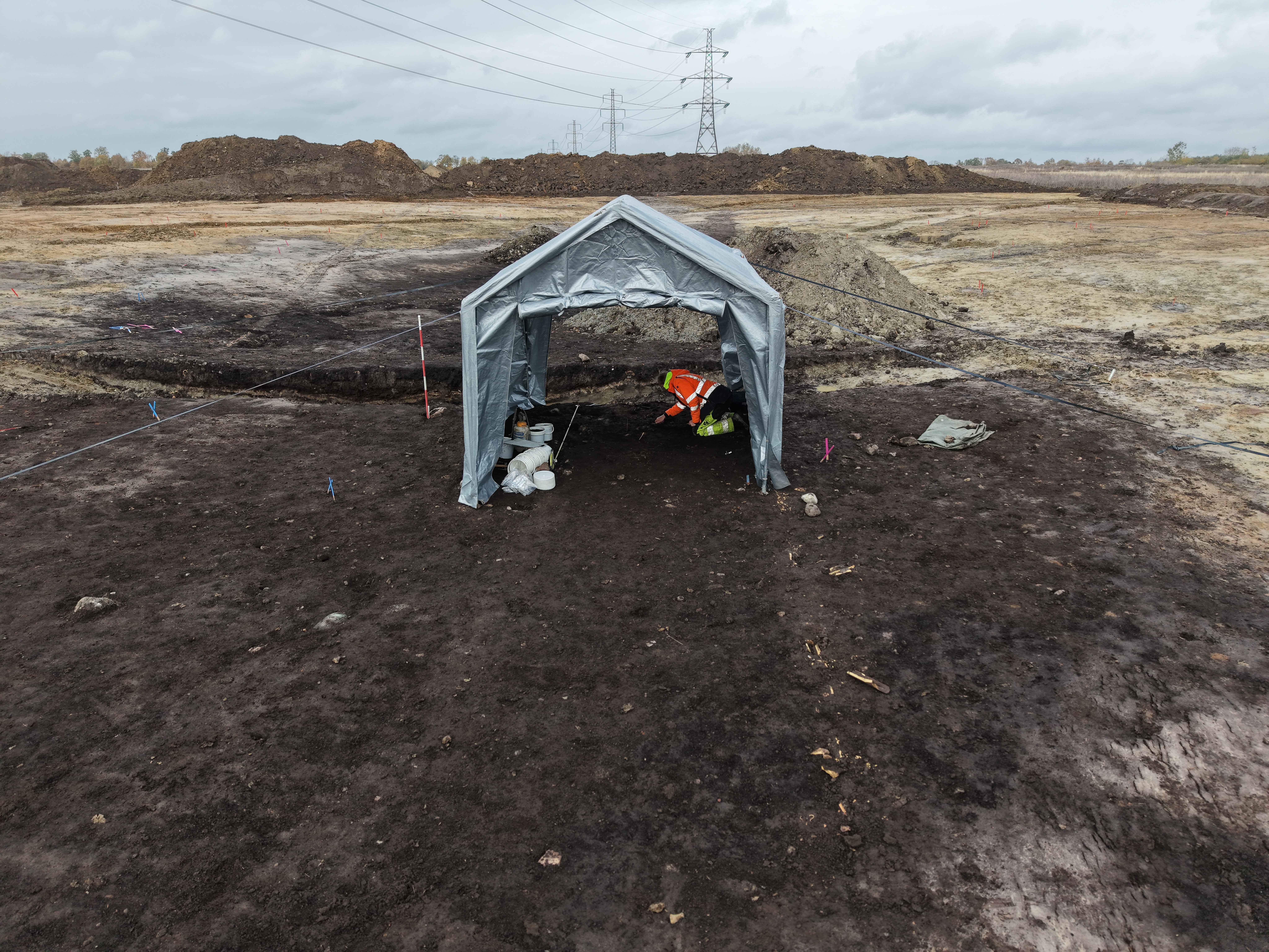 Fra luften ses udgravningsfeltet med teltet placeret over den mørke, fugtige jord – stedet hvor det arkæologiske fund blev gjort. Foto: Kroppedal Museum