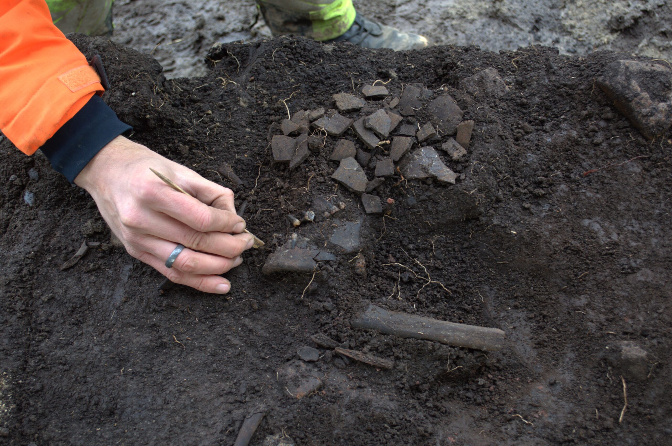 Midt i det 30 hektar store udgravningsområde dukkede noget ganske særligt frem fra den mørke muld: I et forhistorisk vådområde, gemt under lag af tørv, begyndte resterne af et menneske at tage form. Først et kranie med tænder, siden flere knogler og spor af en mulig nedgravning. Det stod hurtigt klart, at arkæologerne stod over for et sjældent moselig – et sjældent fund, som kun få arkæologer oplever at finde i karriere.