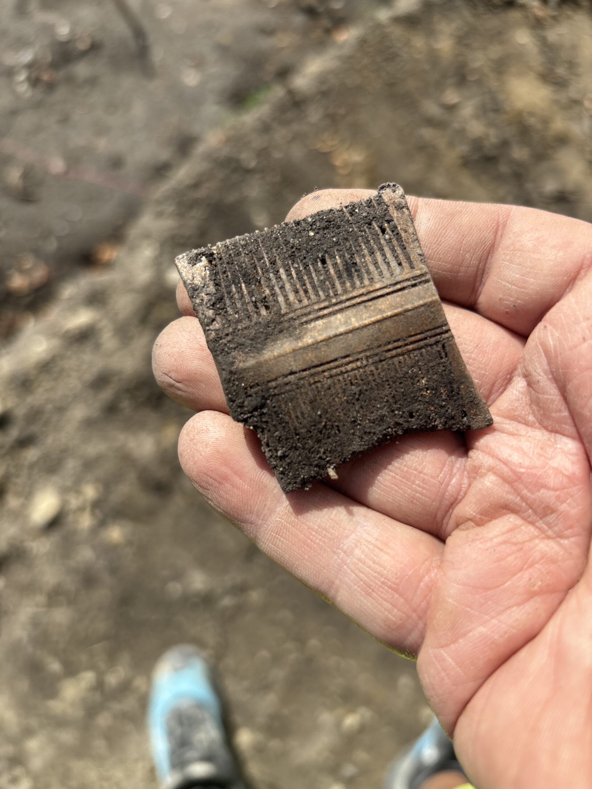 Da en af museets arkæologer dokumenterede en affaldsgrube (nedgravning i jorden til udsmid af affald) dukkede der tre små keramikskår op af den type man kalder Østersøkeramik (fig. 1). Affaldsgruben lå i nærheden af et hus med jordgravede stolper. Østersøkeramikken er dateret til den sene vikingetid/tidlige middelalder (år 900-1200) og er karakteriseret ved, at være dekoreret med vandrette omløbende furer samt bølgelinje.