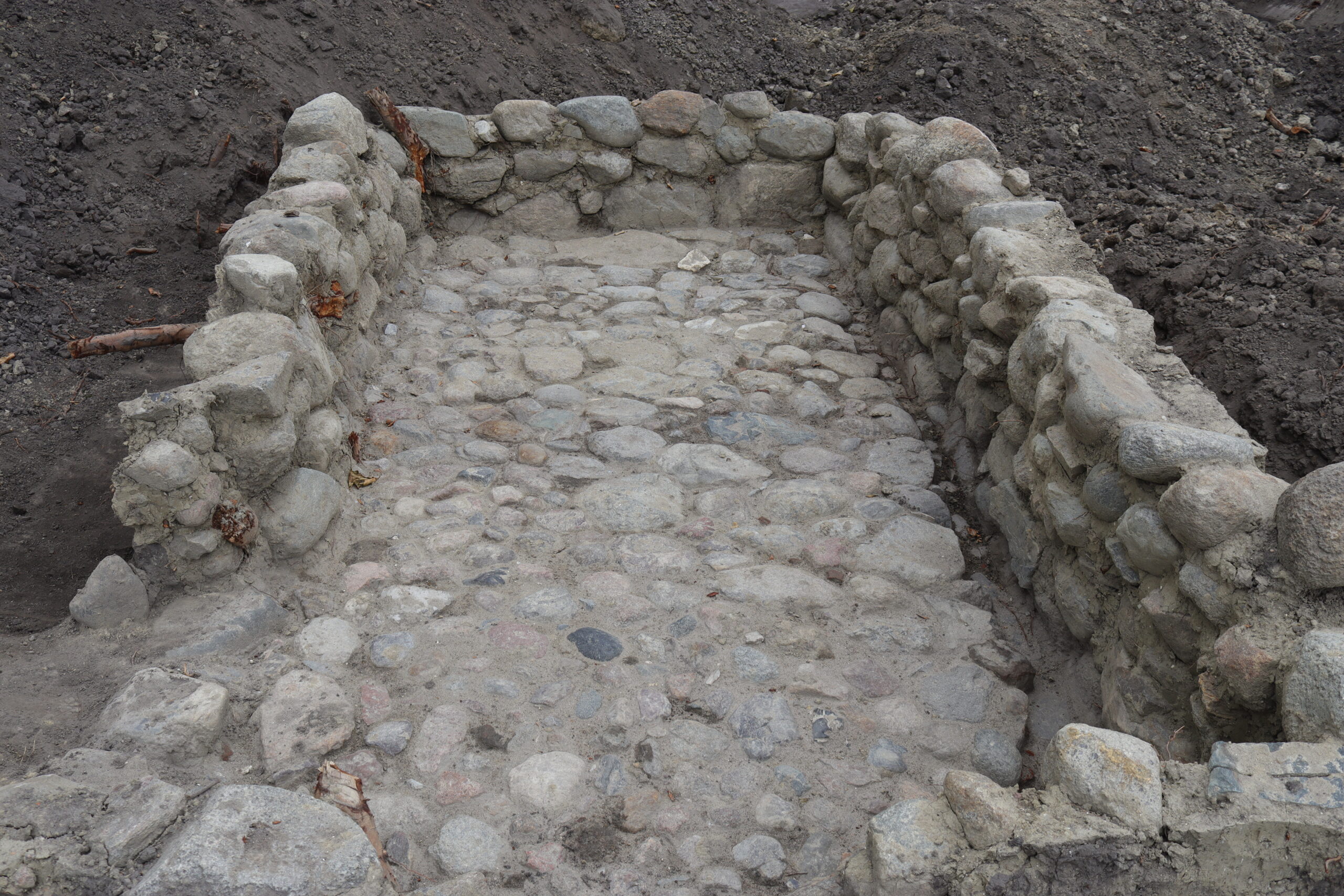 Udgravningens bedst bevarende konstruktion var en stenkælder opbygget af natursten som var sat i kompakt ler (fig. 3). Kælderen målte 4,5 meter i længden og 2,5 meter i bredden. Indvendigt var kældergulvet belagt med pigsten (mindre natursten), som var lagt i et lag af fint sand. Hvor dyb kælderen originalt har været er svært at sige, men den har i hvert fald været 90 cm i højden (ca. 4-5 stenrækker). På den vestlige langside blev der påtruffet rester af trappetrin, hvilket betyder at kælderen også kunne tilgås udefra.